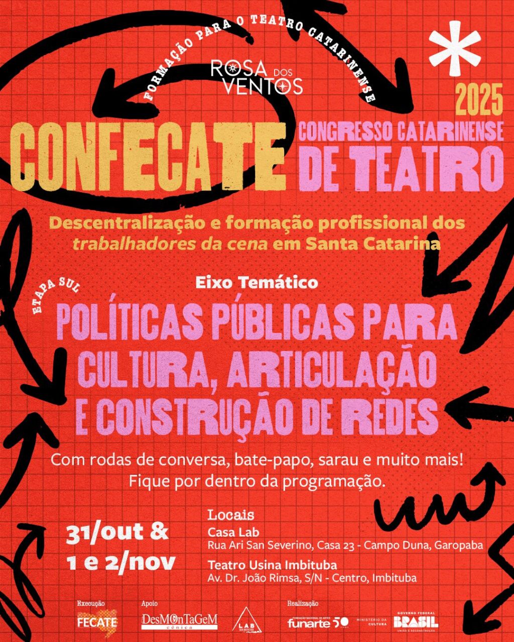 O teatro catarinense terá novo ponto de encontro com a realização da Etapa Sul do Congresso Catarinense de Teatro (ConFECATE) entre os dias 31 de outubro e 2 de novembro de 2025, nas cidades de Garopaba e Imbituba. O evento faz parte do projeto Rosa dos Ventos – Formação para o Teatro Catarinense, que percorre o estado promovendo formação, articulação e descentralização das artes cênicas.