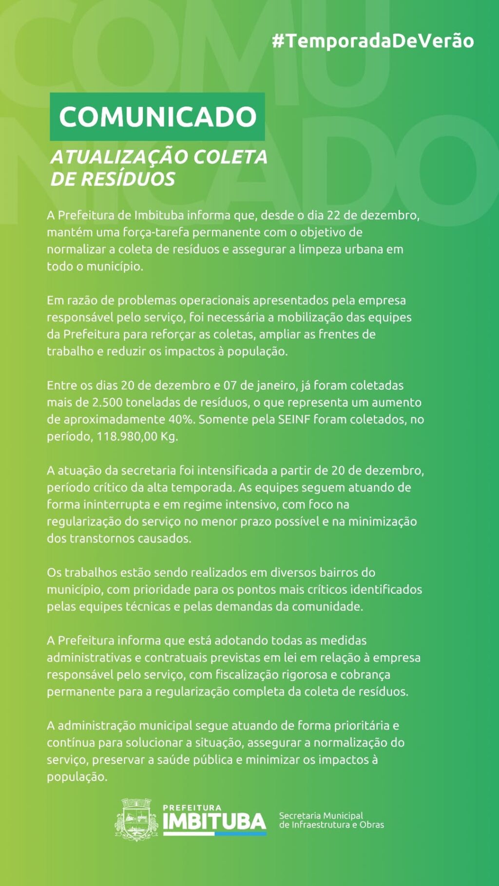 A prefeitura informou que a atuação da secretaria foi intensificada a partir de 20 de dezembro, considerado um período crítico devido ao aumento significativo da população na cidade. As equipes seguem trabalhando de forma ininterrupta e em regime intensivo, com foco na regularização do serviço no menor prazo possível.