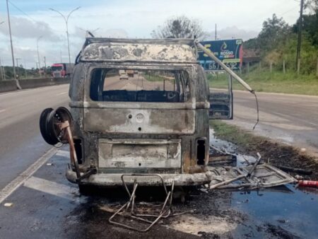 Incêndio destrói Kombi às margens da BR-101 em Imbituba
